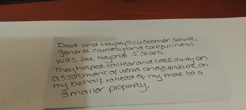 Dave and Hayleys customer service, general courtesy and carefulness was far beyond 5 stars.They helped to clear and take away an assortment of items and furniture on my behalf, ahead of my move to a smaller property. 17/03/2026